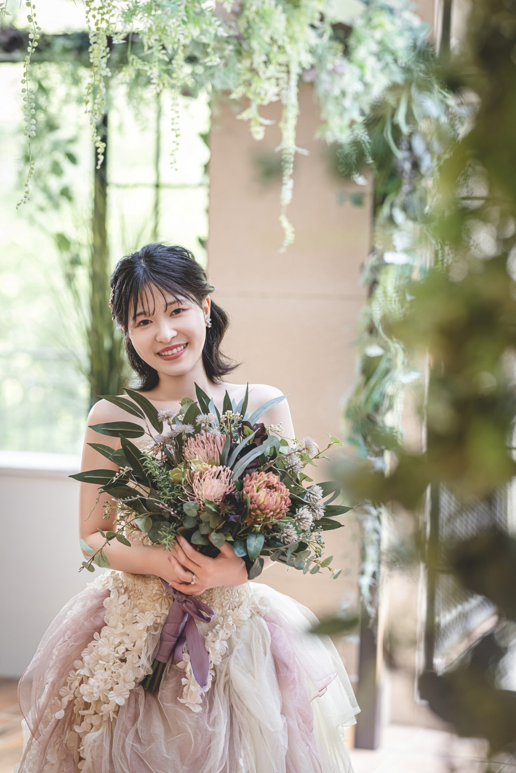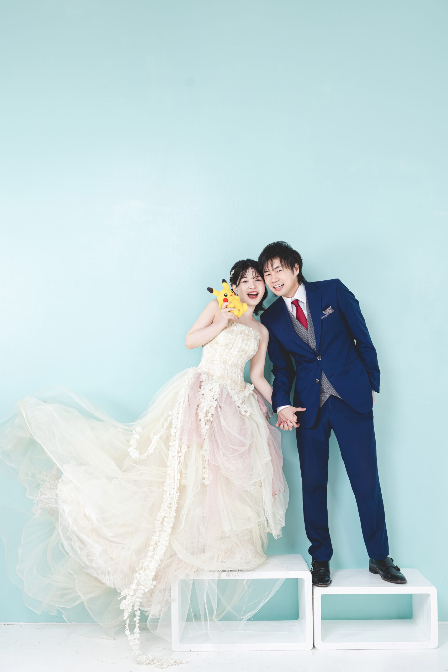 柔らかな光に包まれながら、静かに佇む後ろ姿。 ロングトレーンが描く曲線が、花嫁の凛とした美しさをより一層引き立てていました。 笑顔はじける!ピカチュウと一緒に、最強にキュートな記念ショット♡ おふたりの明るさとピカチュウの元気がぴったりリンクして、撮影中はずっとにっこにこでした!